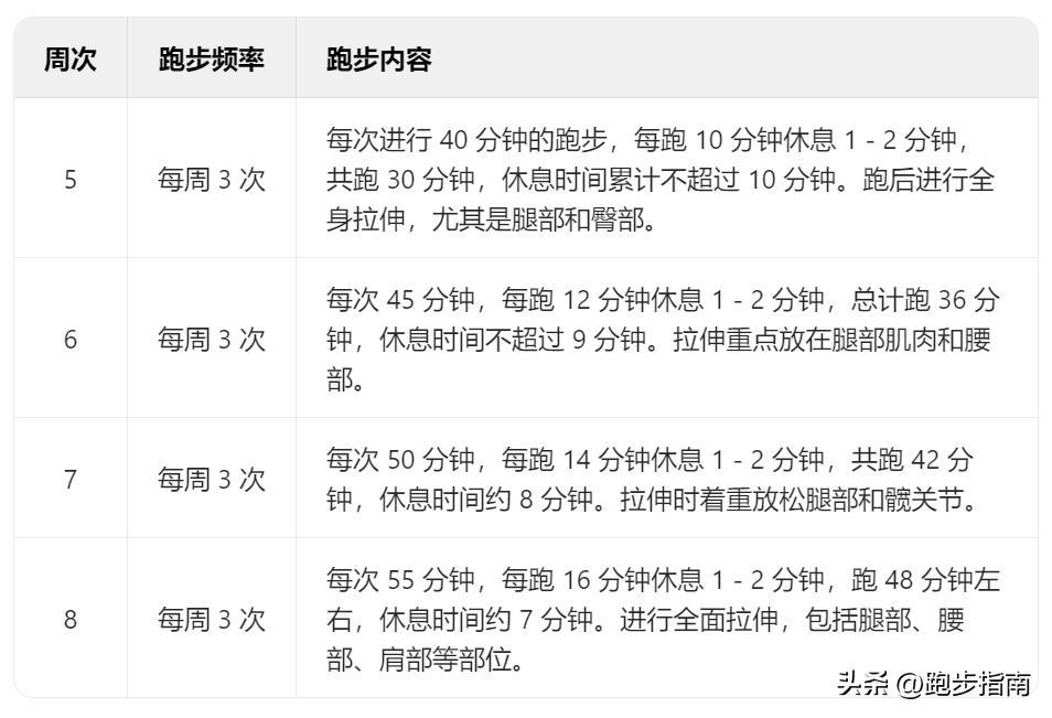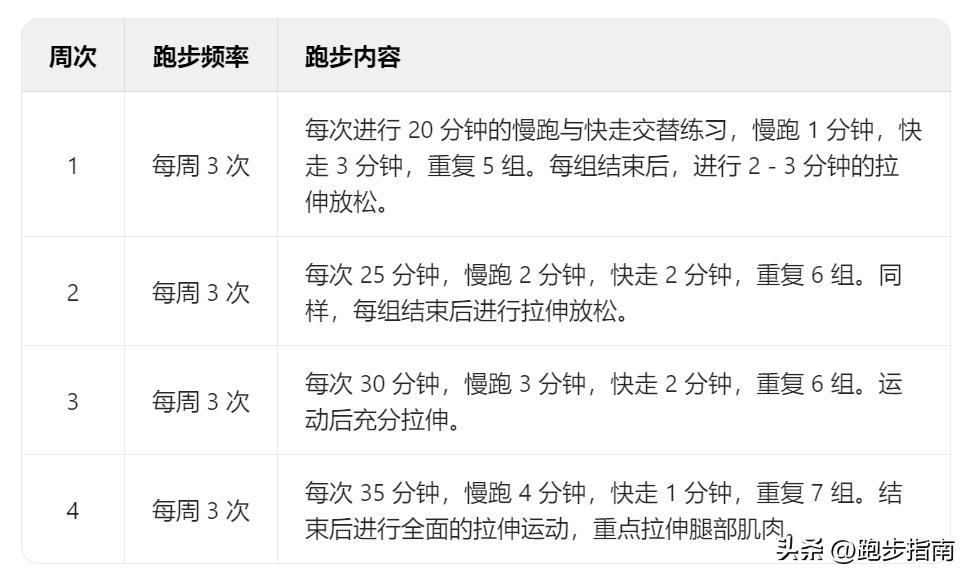 目標:讓身體適應跑步運動,初步建立運動習慣,增強心肺功能和腿部力量。