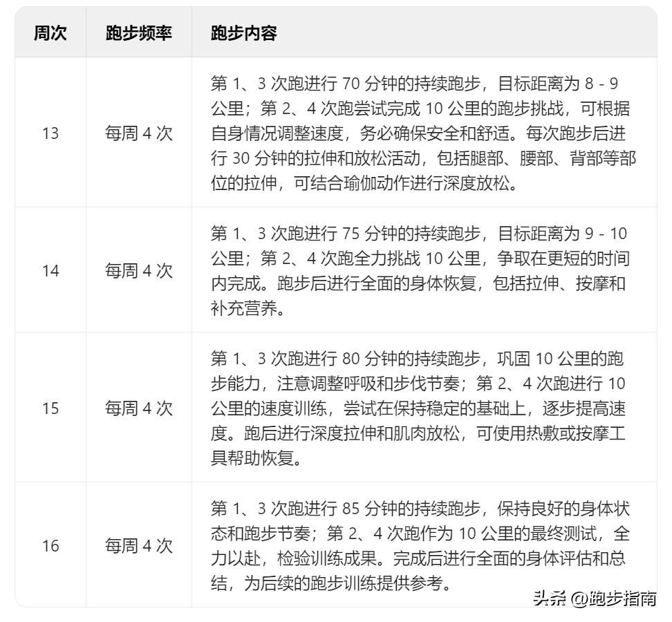 計劃爲期16周,分爲四個階段,每個階段都有明確的訓練目標和安排,逐步增加跑步強度和距離。