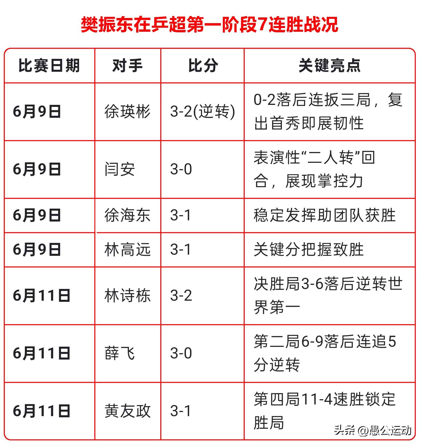 樊振東在乒超第一階段全部出場的7連勝全記錄如下表:
