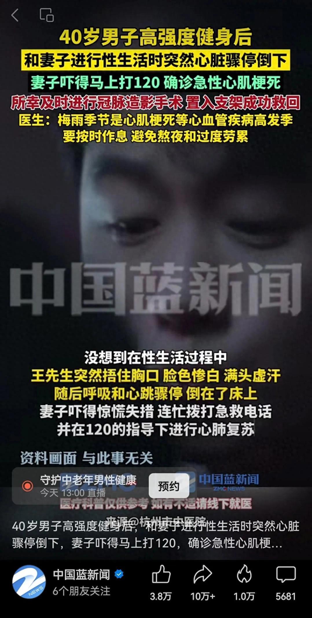 這是最近在視頻號上看到的:說一40歲男子高強度健身後,和妻子進行X生活時突然心跳驟停倒下。確診爲急性心肌梗死,幸好成功救回。醫生提醒:要按時作息,避免熬夜和過度勞累。