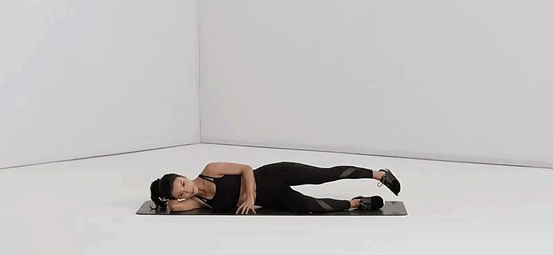 - 側臥在瑜伽墊或者比較平坦的牀上,下方的腿伸直貼緊地面,上方的腿伸直慢慢向上抬起。