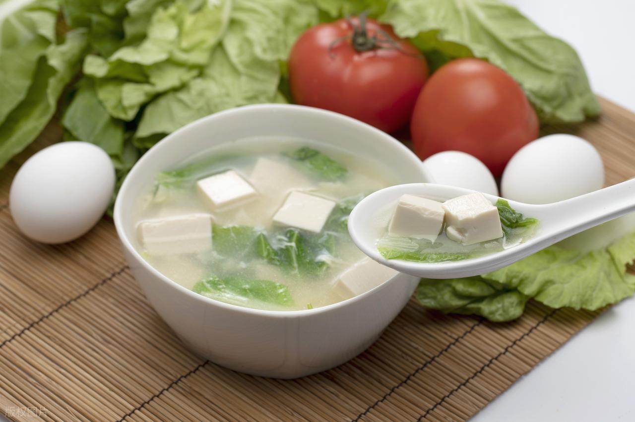 中年人的晚餐,可以喝一碗蔬菜湯(白菜菌菇湯、青菜豆腐湯等)+一顆水煮蛋,熱量比較低,可以給身體補充膳食纖維跟蛋白質,提供長時間飽腹感,還能促進腸道蠕動,減輕腸道負擔。