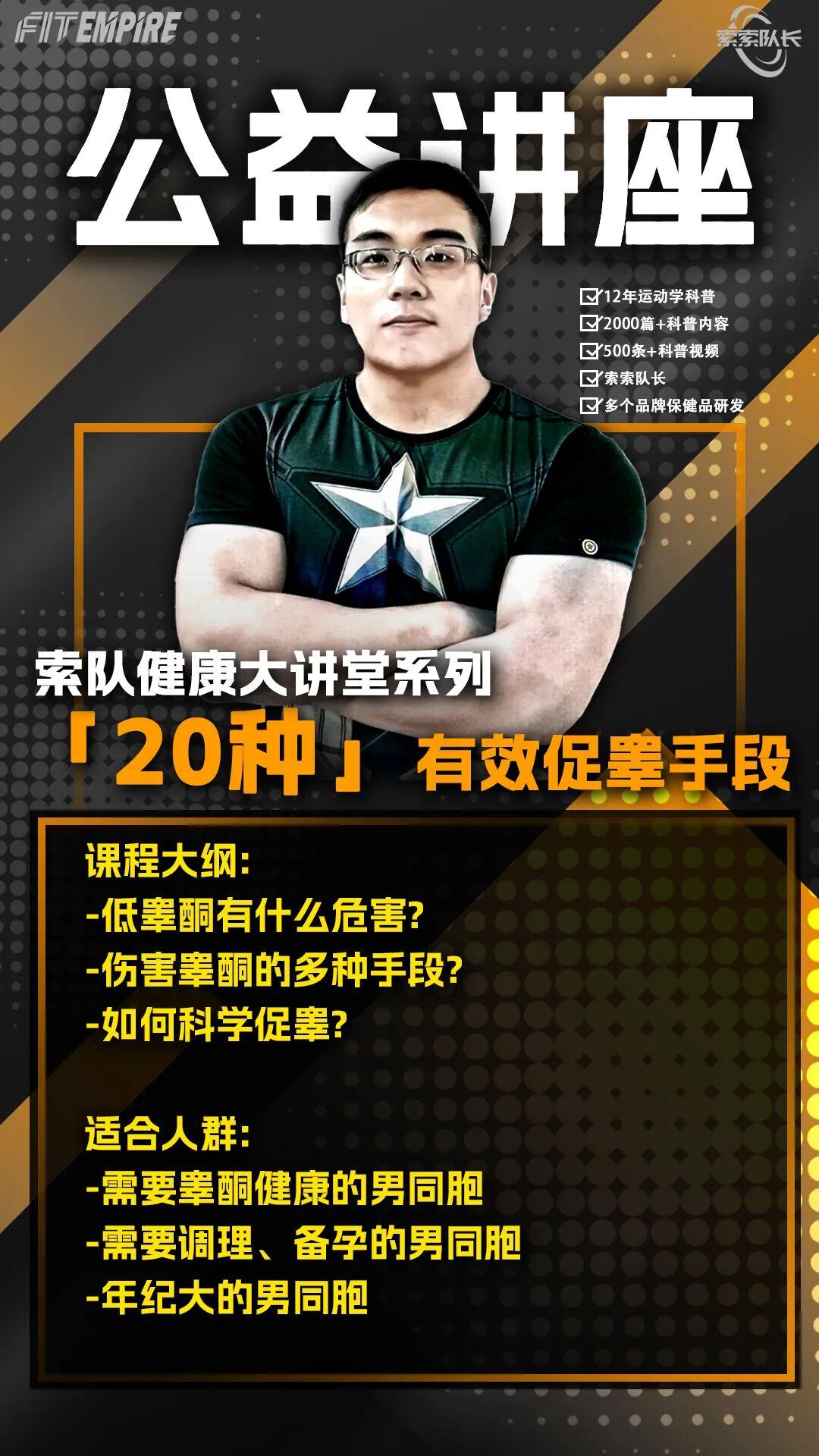 如果對睾酮健康、促睾方法等內容感興趣的,不妨來參加索隊的《20種科學促睾課》。