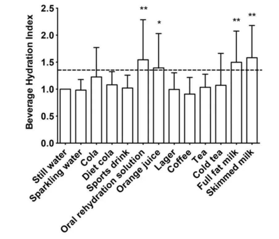 2016年3月發表在《美國臨牀營養學雜誌》的一篇研究顯示,牛奶的補水效果甚至比白水和一些電解質補水飲料都更勝一籌。