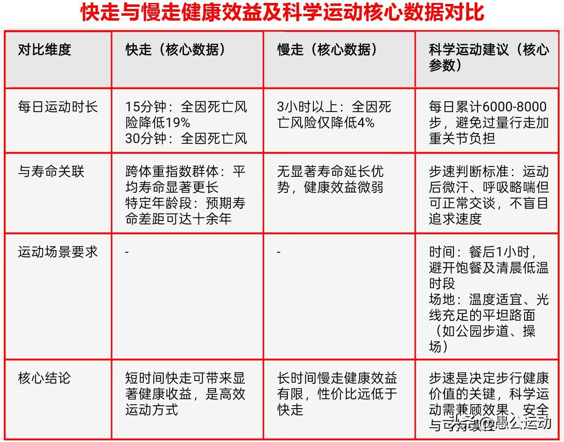請看快走vs慢走健康效益及科學運動核心數據對比表: