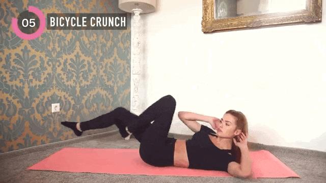 - 動作標準:仰臥,雙手放頭後,模擬騎自行車動作,雙腿交替蹬出,手肘觸碰對側膝蓋。動作堅持30秒,重複2組。