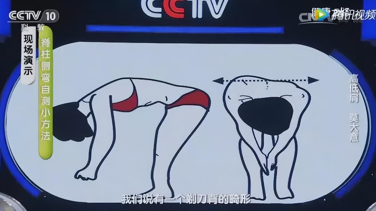 身體輕輕前傾,雙手自然下垂。背部出現的紅色印記若是居中,則是正常,如果出現了側彎,那麼背部一側就會明顯鼓起來。