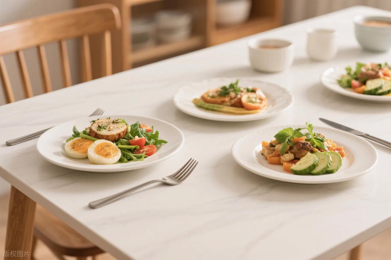 建議,每餐的蔬菜攝入量佔1/2,膳食纖維可以促進腸道蠕動,加速廢物排出,主食佔1/4左右,以全穀物粗糧爲主,可以延長消化時間,減緩血糖波動,高蛋白食物也佔1/4左右,有助於維持肌肉量,這是公認的減脂餐搭配。