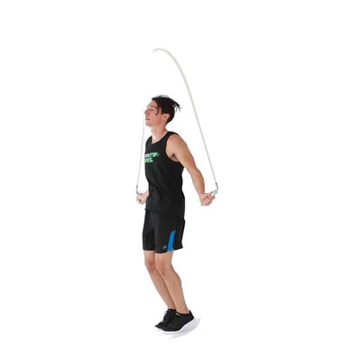 - 雙手握住跳繩手柄,手肘微屈,用手腕輕輕轉動繩子,用前腳掌輕跳起,讓繩子從腳下通過,保持動作流暢,避免跳得過高(2~3釐米即可)。