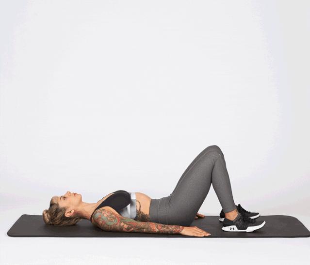 動作要點:保持仰臥屈膝狀態,骨盆後傾、腰部輕微貼地不懸空、臀部主動發力,抬起臀部,直至肩部、腰腹、大腿呈一條直線,再恢復原位。重複10-15次,進行4組。