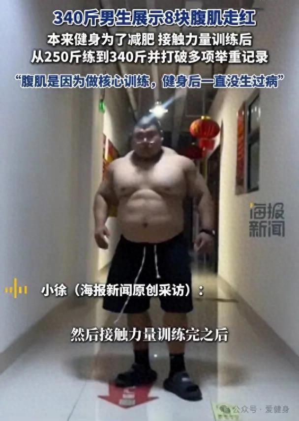海報新聞的報道:說340斤男生小徐憑藉8塊腹肌走紅網絡。本來健身是爲了減肥,後來減到190斤,就開始力量訓練增重。8塊腹肌是大重量硬拉和深蹲自然練出來的。現在幾年都沒生過病,還打破了多項舉重紀錄。