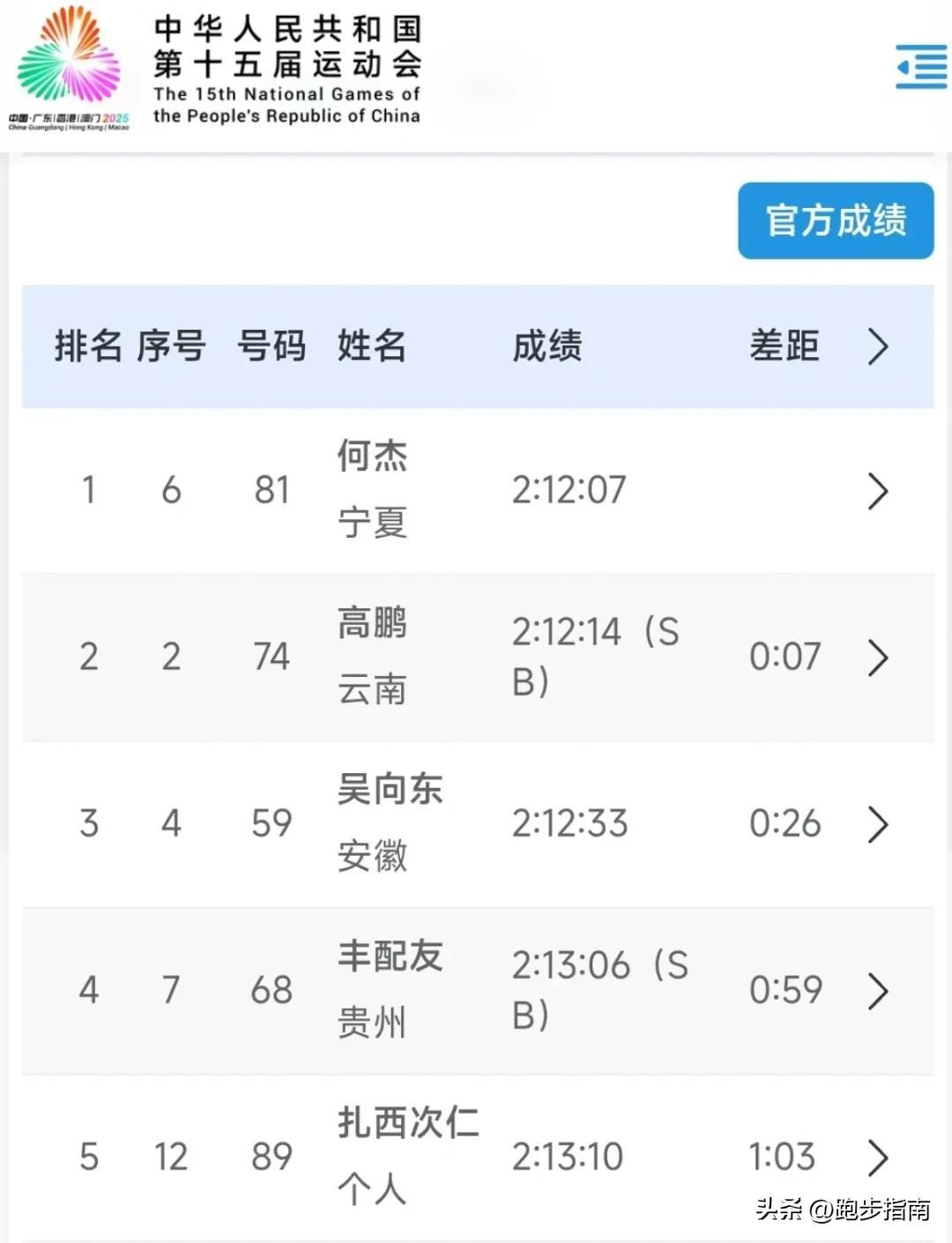 何傑時常用頭回望身後的情形,不是害怕,大局觀讓他明白如何收尾,將這領先優勢穩穩的保持到終點線,高鵬以2小時12分14秒獲亞軍,吳向東2小時12分33秒獲季軍。
