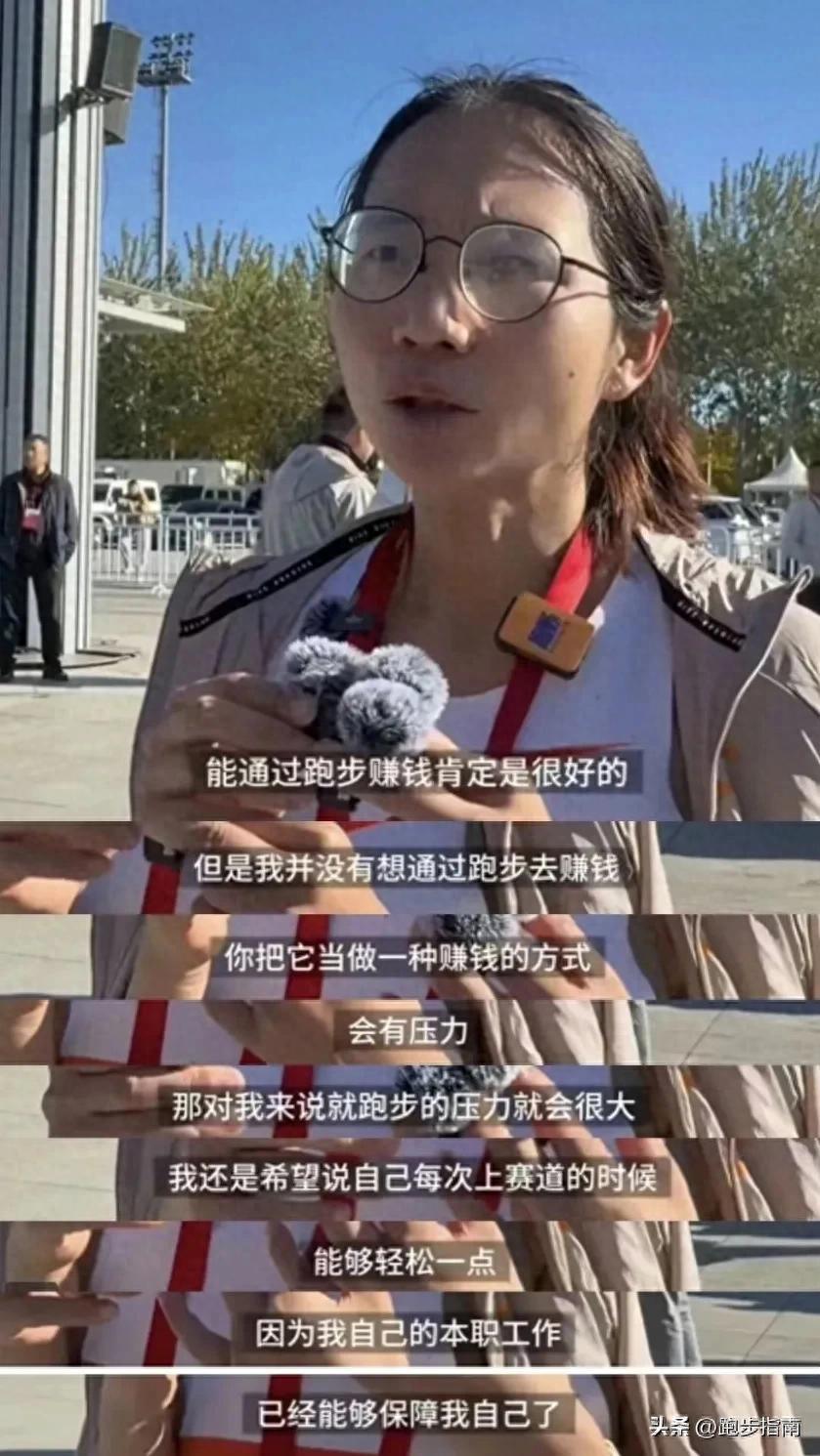 2025北京馬拉松終點線前,剛剛以2小時31分28秒的成績獲得國內女子組冠軍的黃雪梅,扶着膝蓋喘着氣說了一句讓跑圈安靜的話:"能通過跑步賺錢肯定是很好的,但是我並沒有想通過跑步去賺錢。"