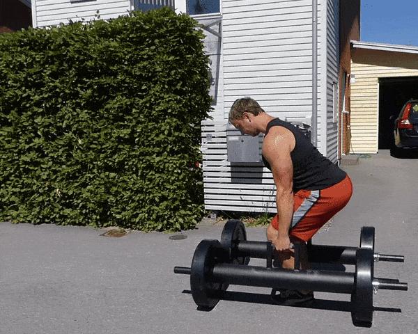 -彎曲髖部和膝蓋去抓住槓鈴,雙手握距略寬於肩,可以用正握(雙手手心朝向自己)或混合握法(一隻手心面向自己,另一隻手心向外)。