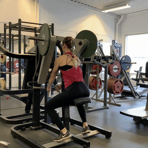 -先把器械調整好,讓你只需要稍微伸直腿就能推起重量。把安全插銷調整到合適的位置,這樣你推不動了它也能幫你卡住重量。