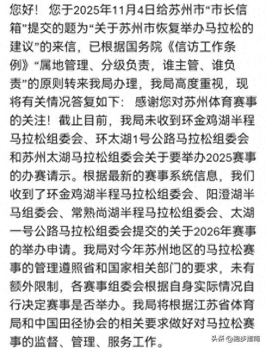 據蘇州市“市長信箱”的回覆內容顯示,環金雞湖半程馬拉松、陽澄湖半程馬拉松、常熟尚湖半程馬拉松、太湖一號公路馬拉松組委會均已提交2026年賽事舉辦申請。