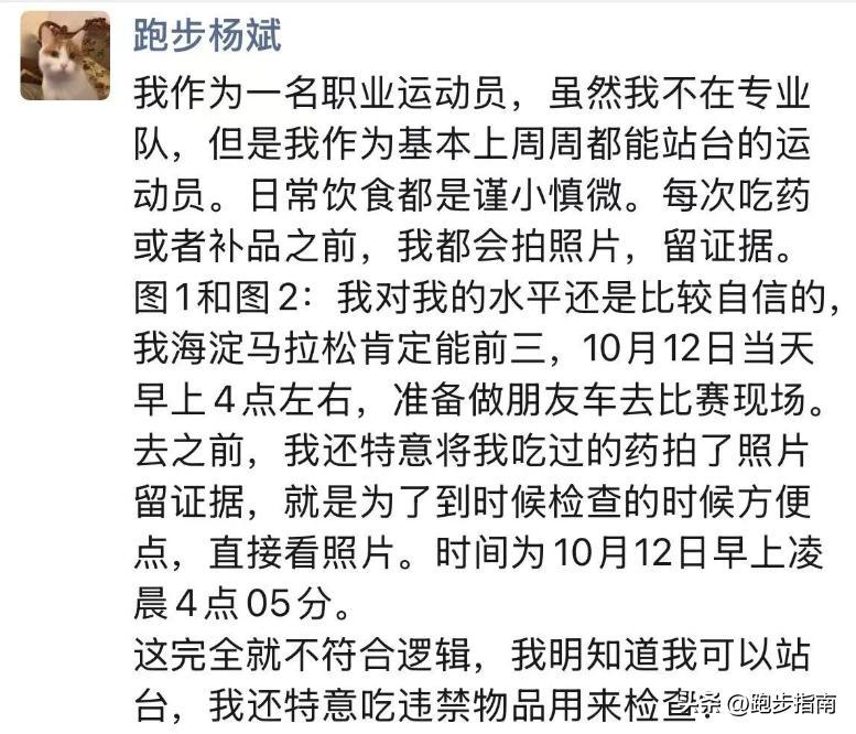 不少熟悉楊斌的老跑友對這個結果頗感意外,因爲楊斌在參賽後的朋友圈裏表達了喫驚和不解,列出了自己這段時間的所有參賽比賽、每次賽前的嚴謹飲食用藥、直到奪冠那場的前兩場比賽都一直自律,質疑檢測結果的邏輯,表達願意配合調查的態度。
