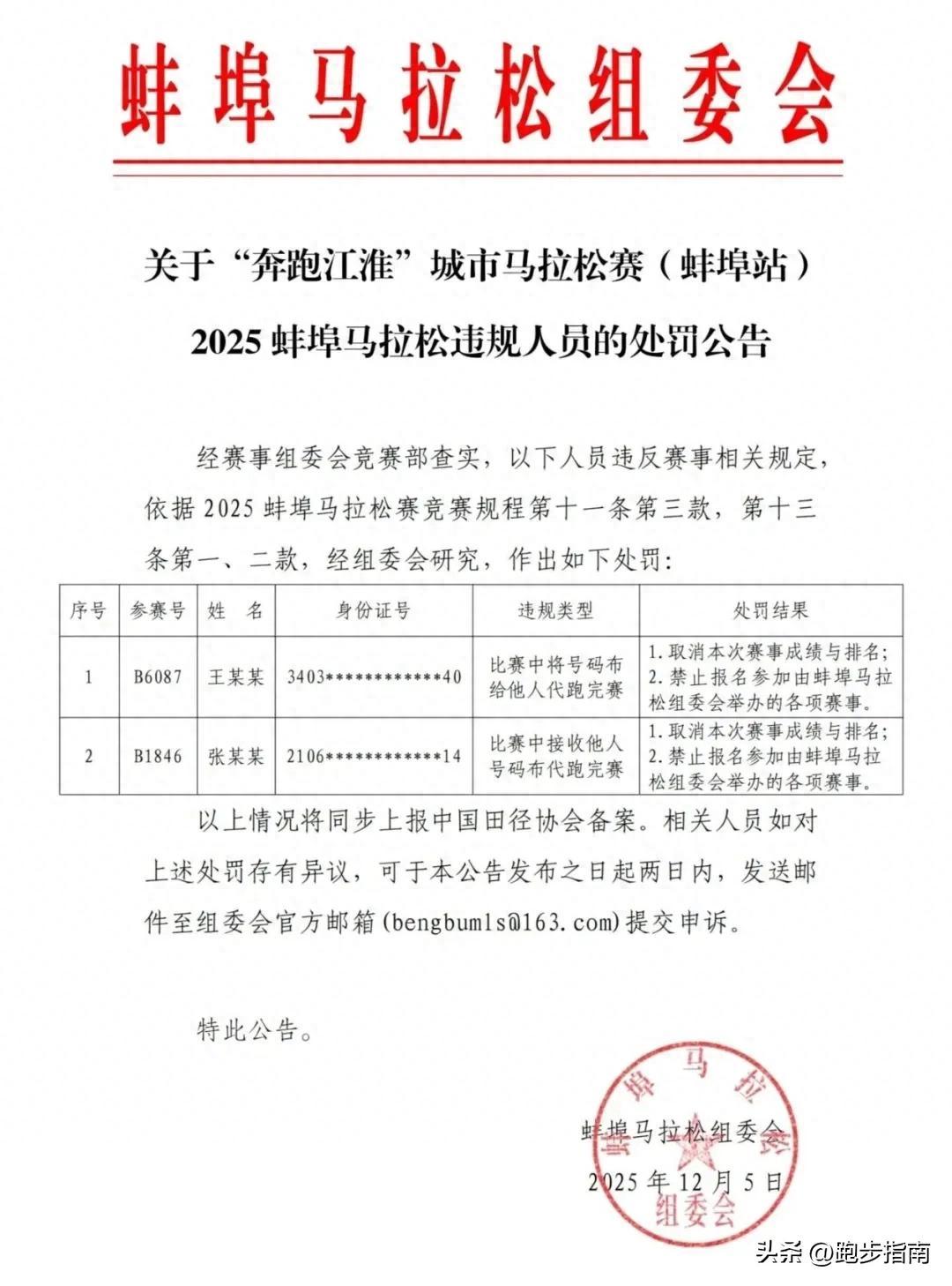 12月5日蚌埠馬拉松公佈處罰公告:兩名選手在比賽中轉讓號碼布代跑,違反了賽事規定,最終被取消本次成績,並處以禁賽處罰,不得參加蚌埠馬拉松組委會旗下全部賽事,相關信息也已提交中國田協備案。