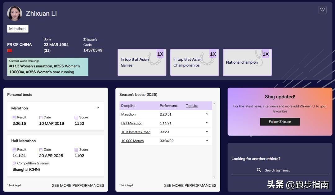 除了上海馬拉松的優異表現,她還在亞錦賽中以2小時26分奪冠,兩場高標準賽事的出色發揮,讓她的排名實現跨越式提升。
