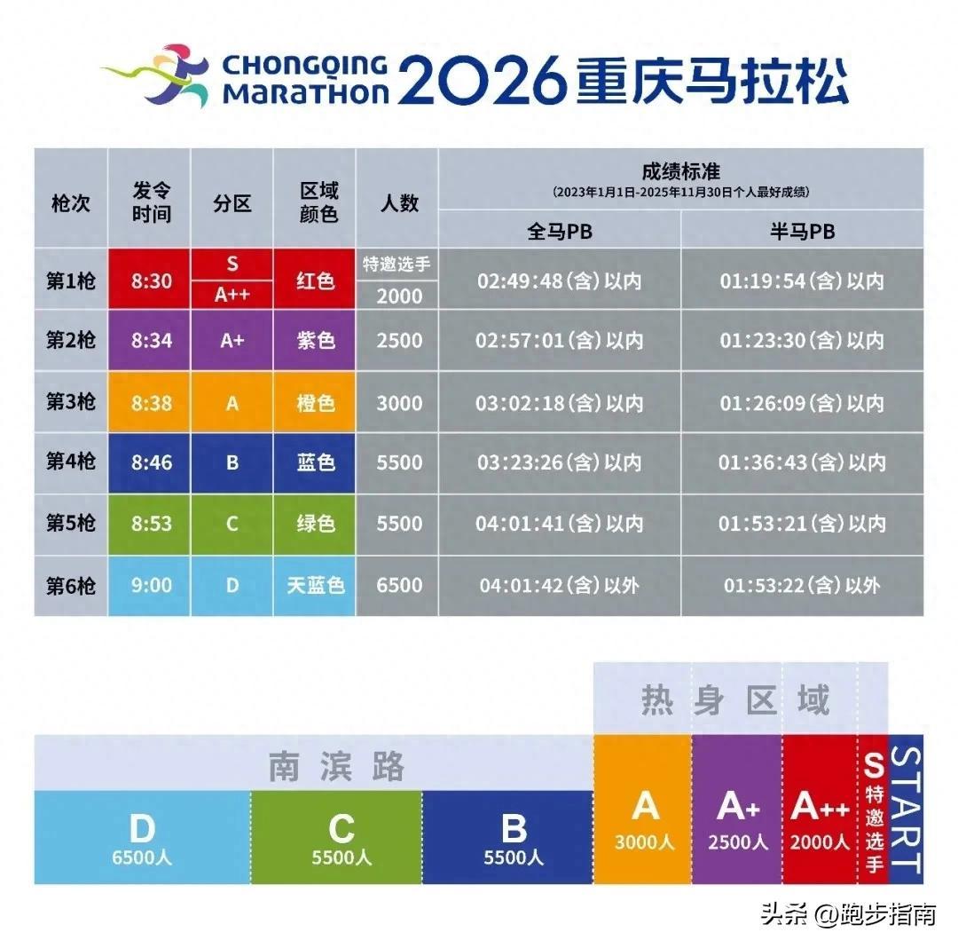 其中A++區門檻最高,全馬需在2小時50分以內,半馬1小時20分以內,2000名選手將與特邀選手同批第一槍出發;