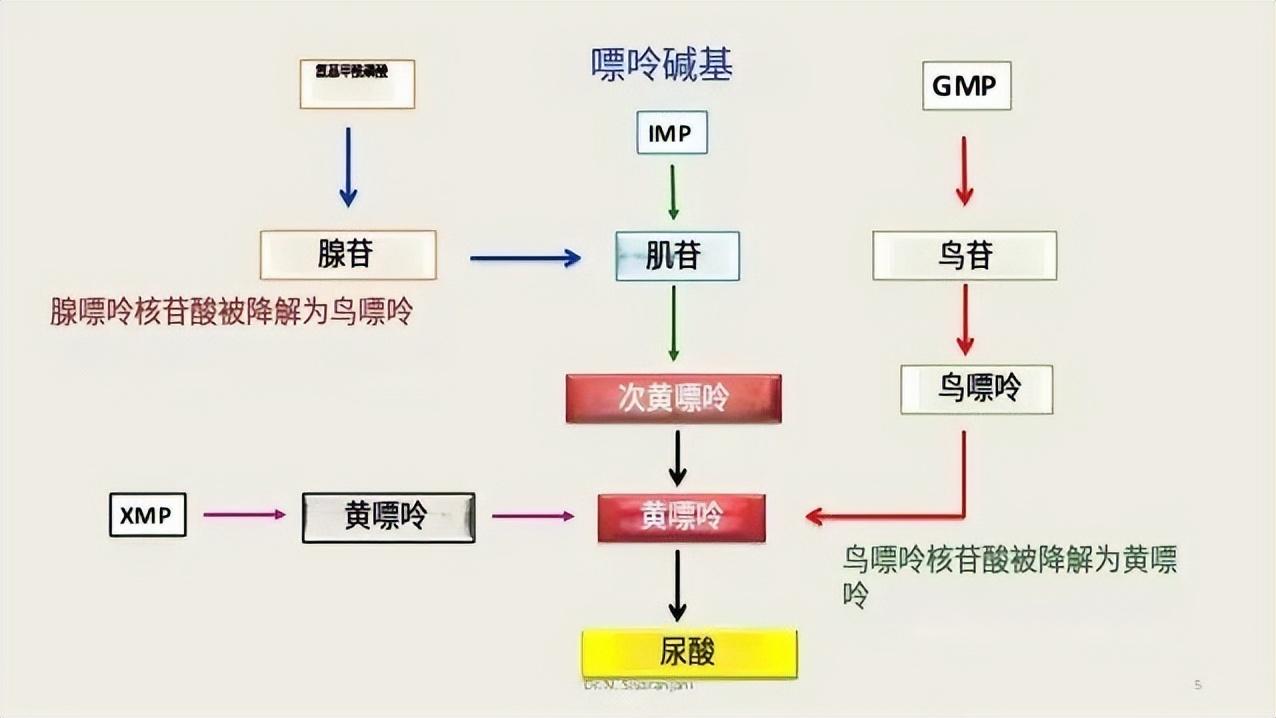 嘌呤這玩意很多食物裏有,咱身體自己也生成,大約80%的嘌呤都來自身體細胞分解,只有20%是喫進去的。