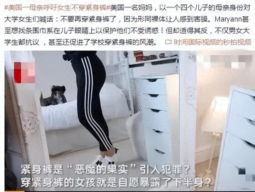 之前美國一母親呼籲女生不要穿緊身褲,她以一位四個兒子的母親身份對大學女生們喊話:不要再穿緊身褲了,因爲形同裸體讓人感到害臊。她甚至想找條圍巾系在兒子眼睛上,以保護他們不受誘惑。但這次喊話卻適得其反,不僅男女大學生都抗議,甚至還促進了學校穿緊身褲的風潮。