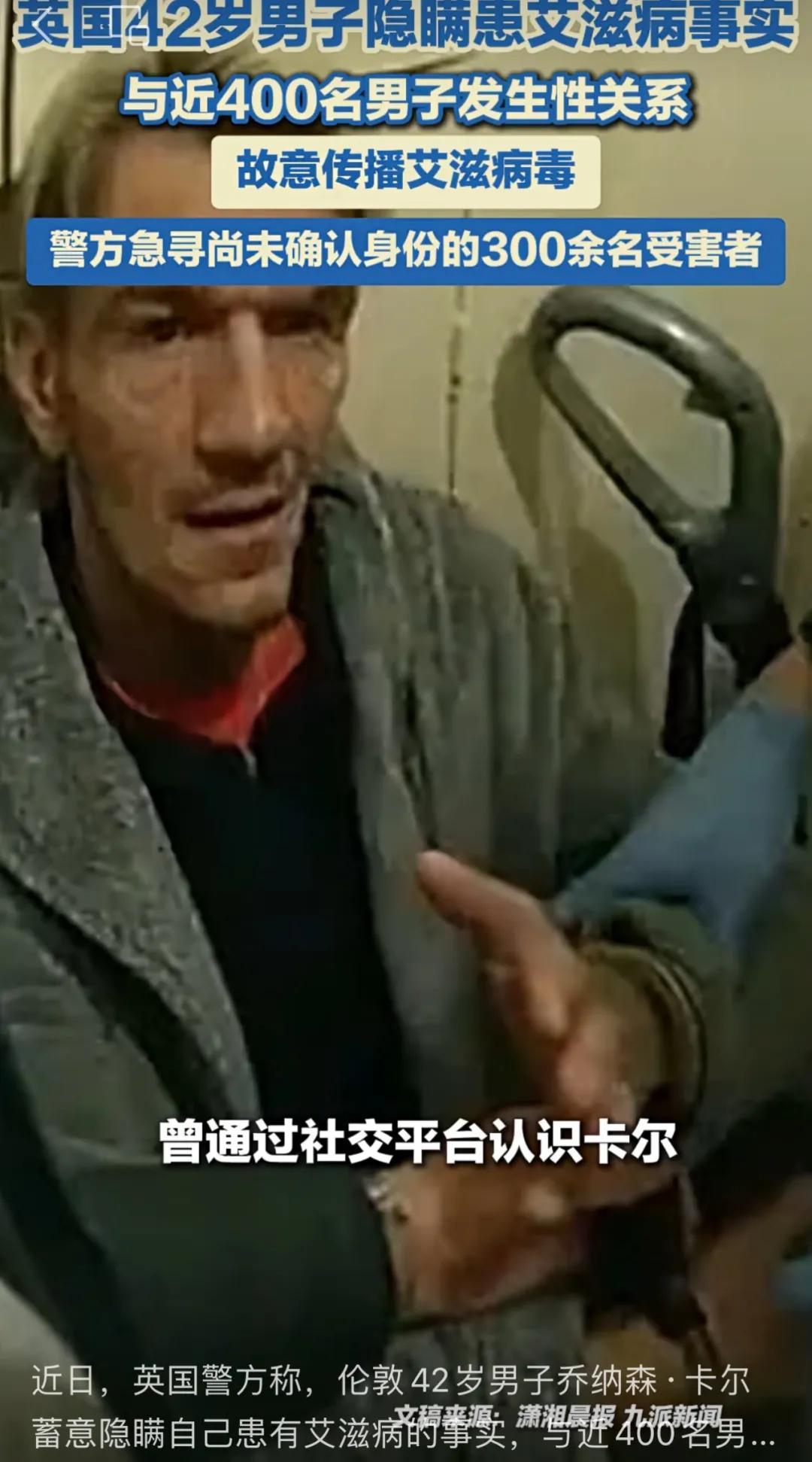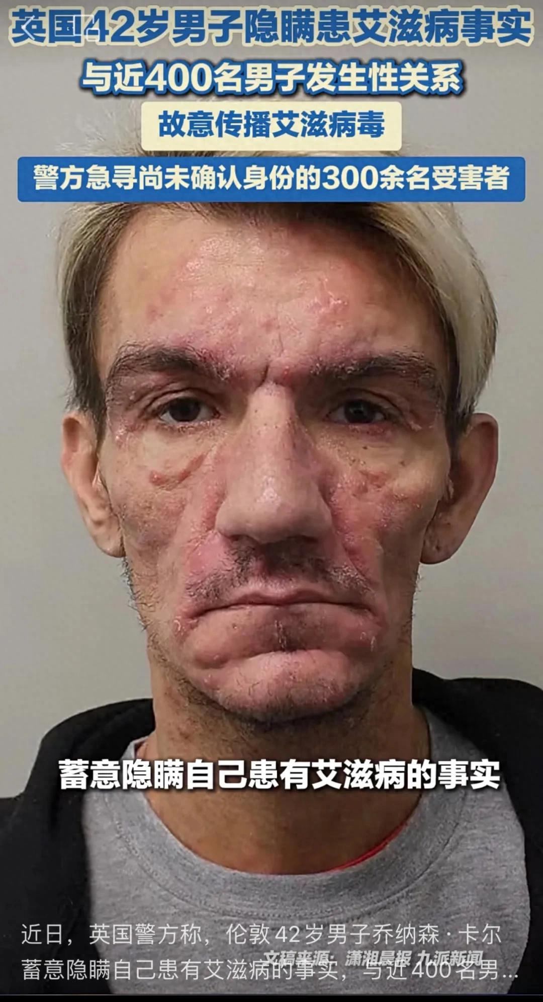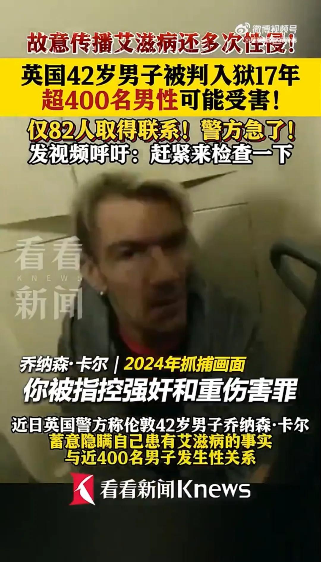 事情是這樣的:近日英國警方稱,42歲男子喬納森·卡爾隱瞞自己患有艾滋病,與超400名男子發生性關係。這400人中,只有82人取得聯繫。警方也是急了,發視頻呼籲其他人趕緊去查一下。