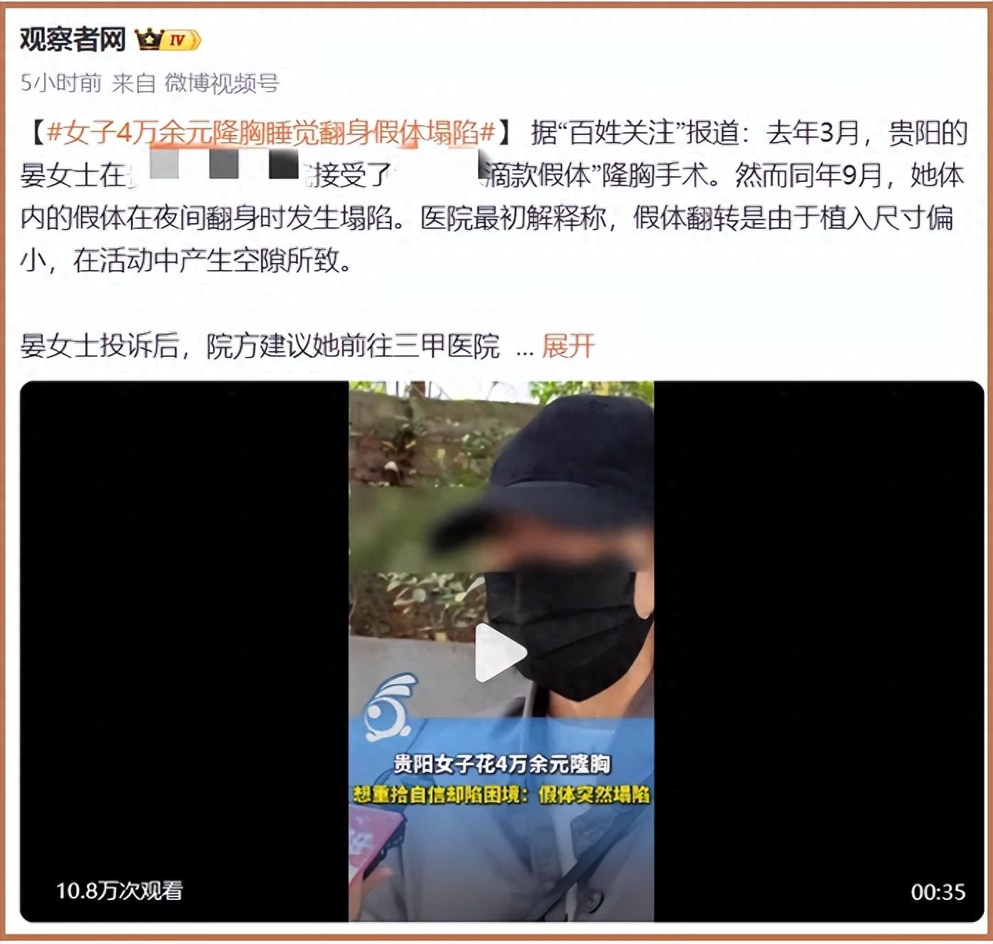事情是這樣的:說貴陽的一位女子接受了隆胸手術,晚上睡覺翻身後假體翻轉。女子強忍着疼痛熬到天亮,第二天到隆胸醫院質疑假體有質量問題,醫院則表示假體沒有問題……導致一場隆胸糾紛。