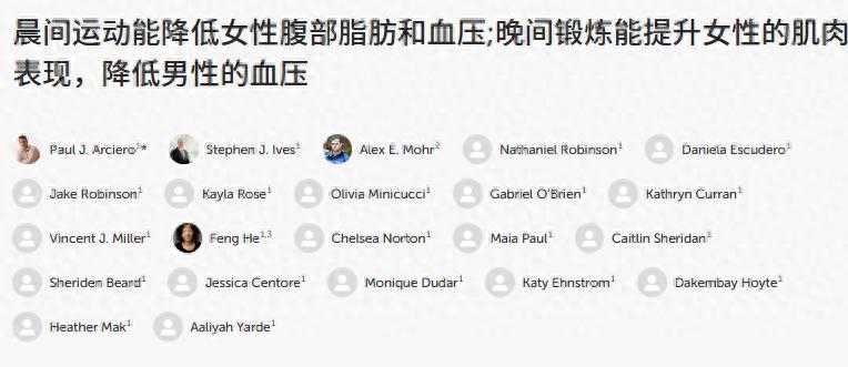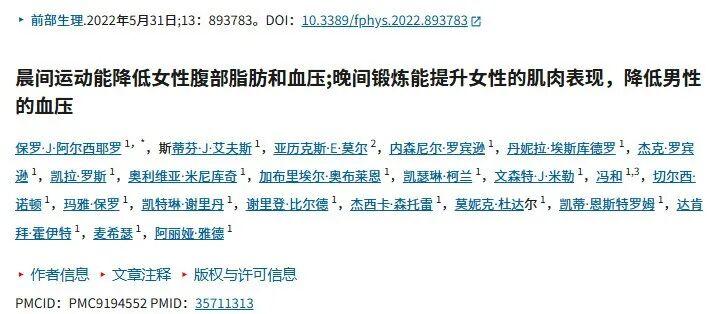 1、Arciero et al. (2022). Morning Exercise Reduces Abdominal Fat and Blood Pressure in Women; Evening Exercise Increases Muscular Performance in Women and Lowers Blood Pressure in Men. Frontiers in