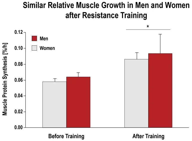 不過,肌肉蛋白質合成的基礎速率並不是唯一決定肌肉增長速度的因素,即使在高強度力量訓練後,新增肌肉組織的數量上也沒有明顯的性別差異。