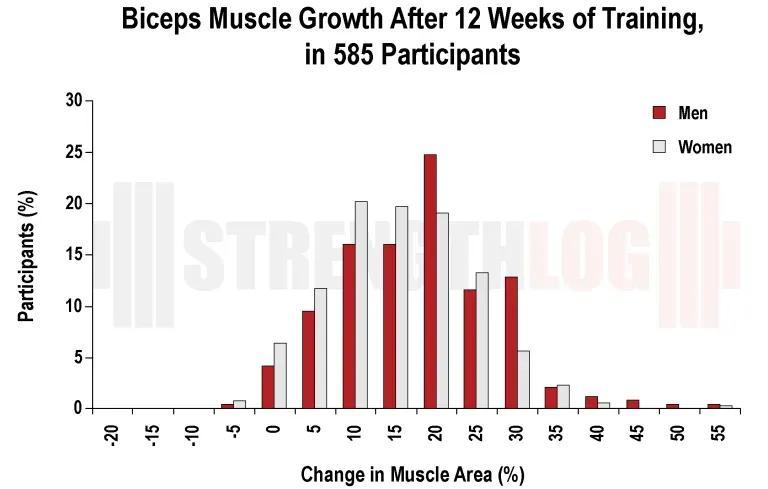 2013年12月發表在《BioMed Research International》的一項涉及585名參與者的大規模研究中,其中58%是女性,經過12周的二頭肌訓練後,男女在相對肌肉質量上沒有發現差異。