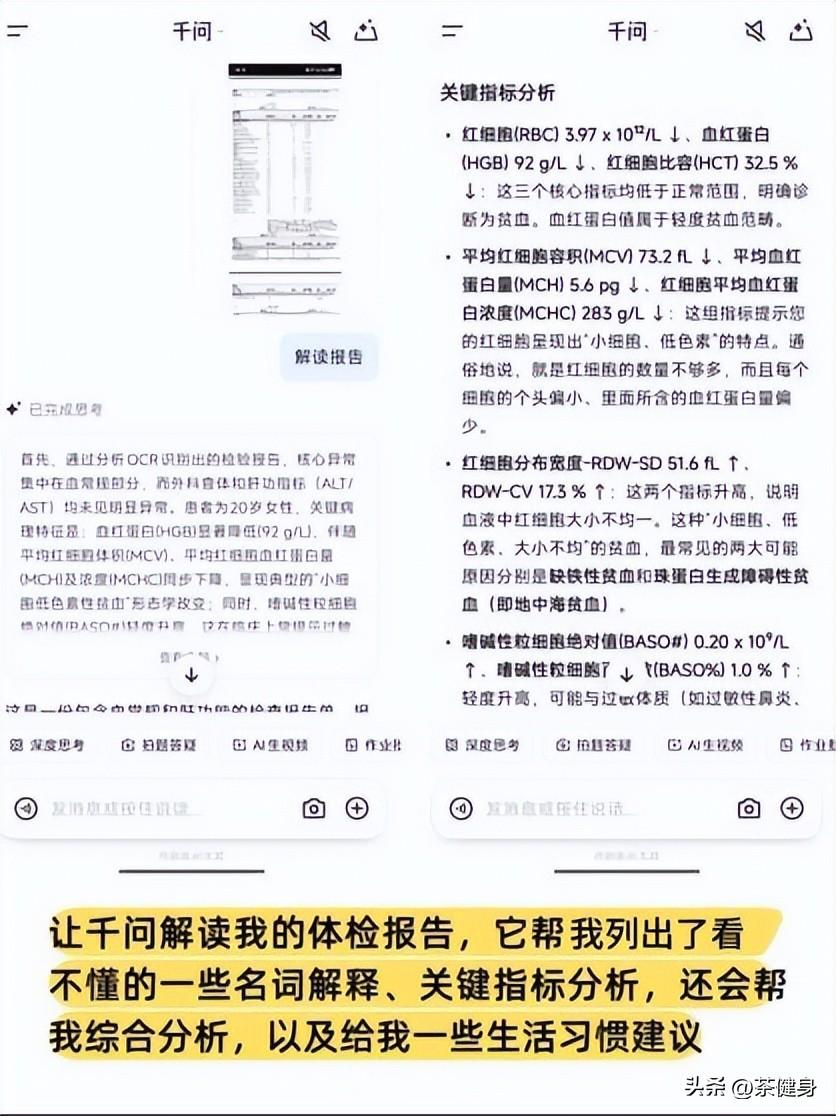 正說着,朋友強烈推薦了千問AI健康助手讓我把報告發上去看看。起初我半信半疑:AI真能提供醫療級建議?但實際體驗後,這份疑慮被徹底打消。