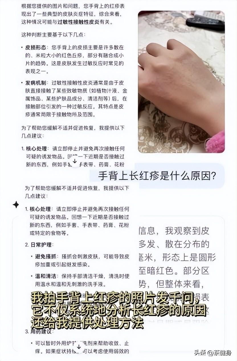 ● 皮膚問題諮詢:上傳手背紅疹照片後,AI未急於下結論,而是系統分析潛在原因,清晰區分“普通過敏”與“需緊急就醫”的情況。