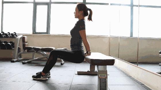 動作要點:雙手撐在穩固的椅子或牀邊,臀部懸空,屈肘下放身體。手肘彎曲接近90度,再慢慢恢復直臂狀態。