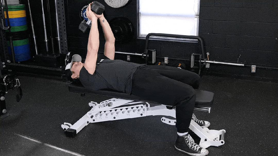 先在手裏拿好啞鈴,然後躺在健身凳上,你可以橫着就把肩膀貼在凳子上,但大多數人覺得豎着躺在椅子上更舒服、更穩當。