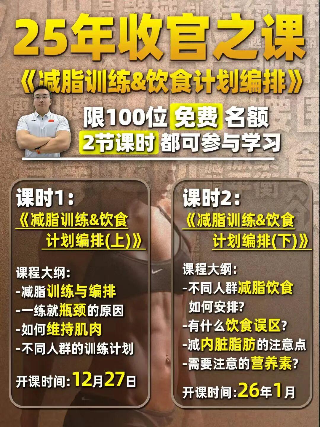 索隊最新的免費課程《減脂訓練、飲食指南》,2025年收官課程,公衆號/視頻號粉絲免費報名,要參加的抓緊找我。