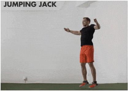 做法:站立狀態,跳起時雙腳打開,雙手在頭頂擊掌,保持膝蓋微屈緩衝,用核心收緊身體;跳回時雙腳併攏,雙手放回體側。動作重複1-2分鐘,進行5組。