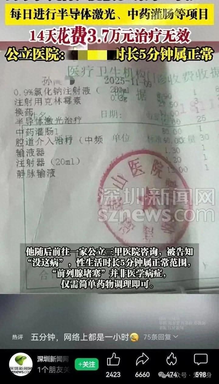 事情是這樣的:來自深圳新聞網的視頻號分享,說一38歲男子覺得自己夫妻生活時間越來越短,偶然間通過網絡瞭解到某民營醫院在男科方面有經驗,便前往就診。前後14天花了3.7萬餘元,進行半導體激光、中藥灌腸等項目,症狀卻沒有明顯改善。然後他前往當地一家公立醫院檢查,結果醫生告訴他不屬於早xie。