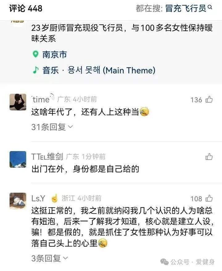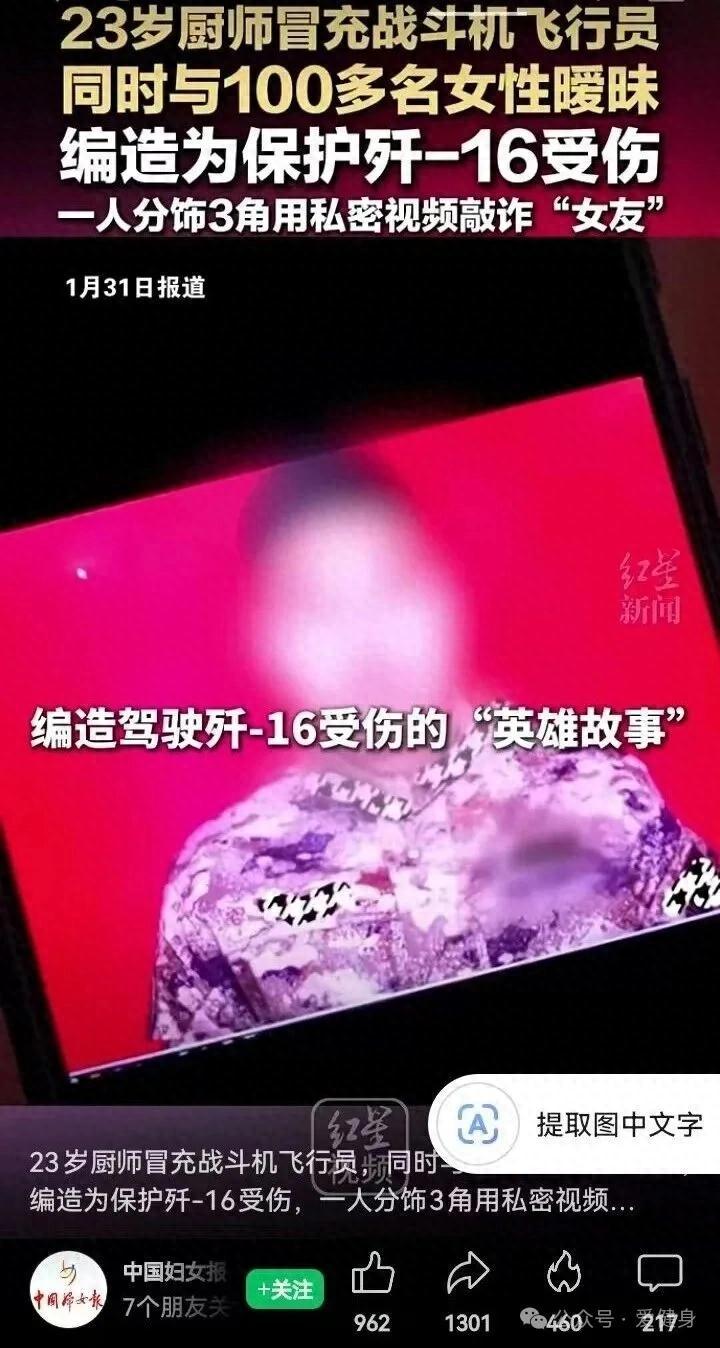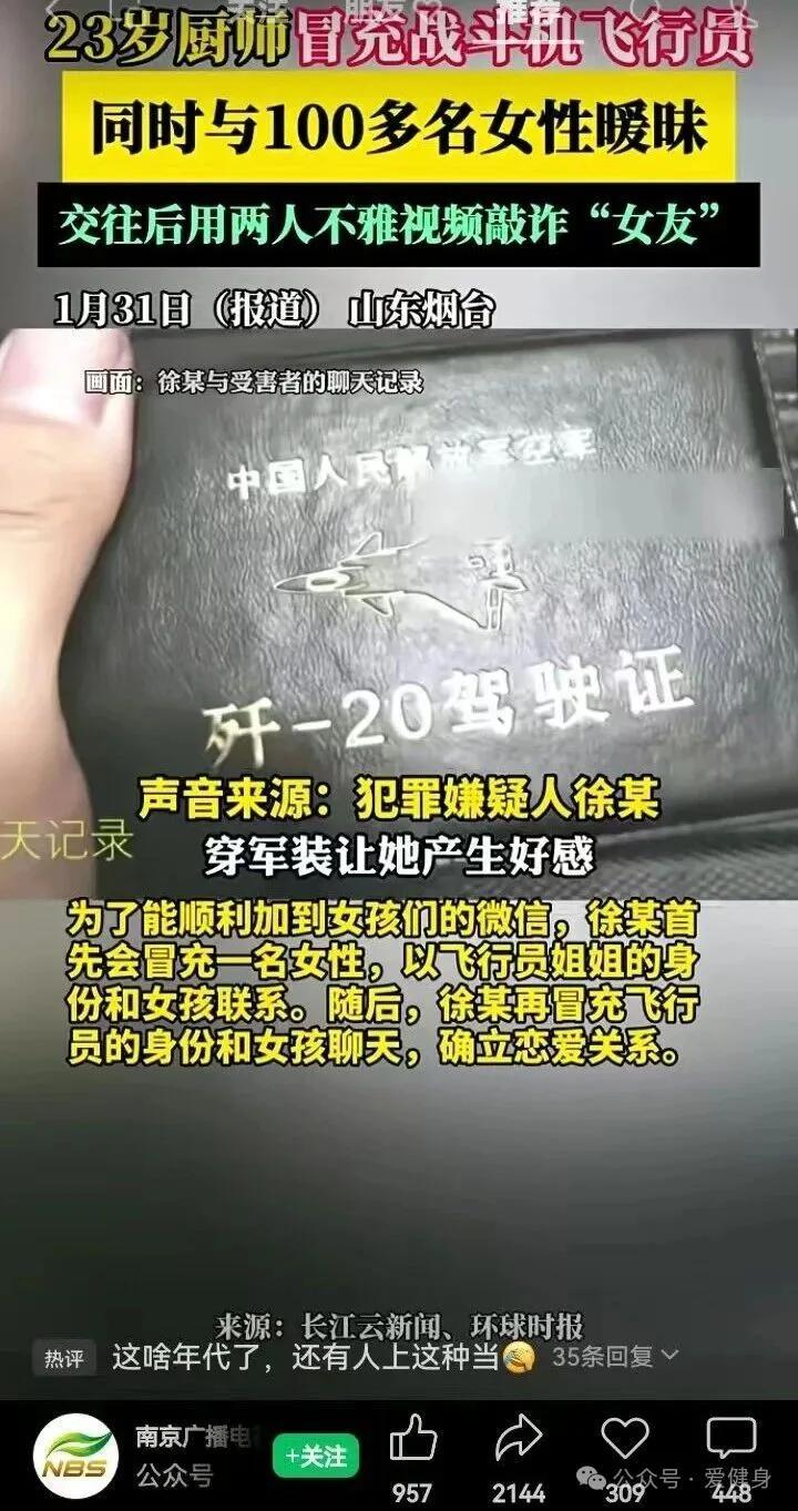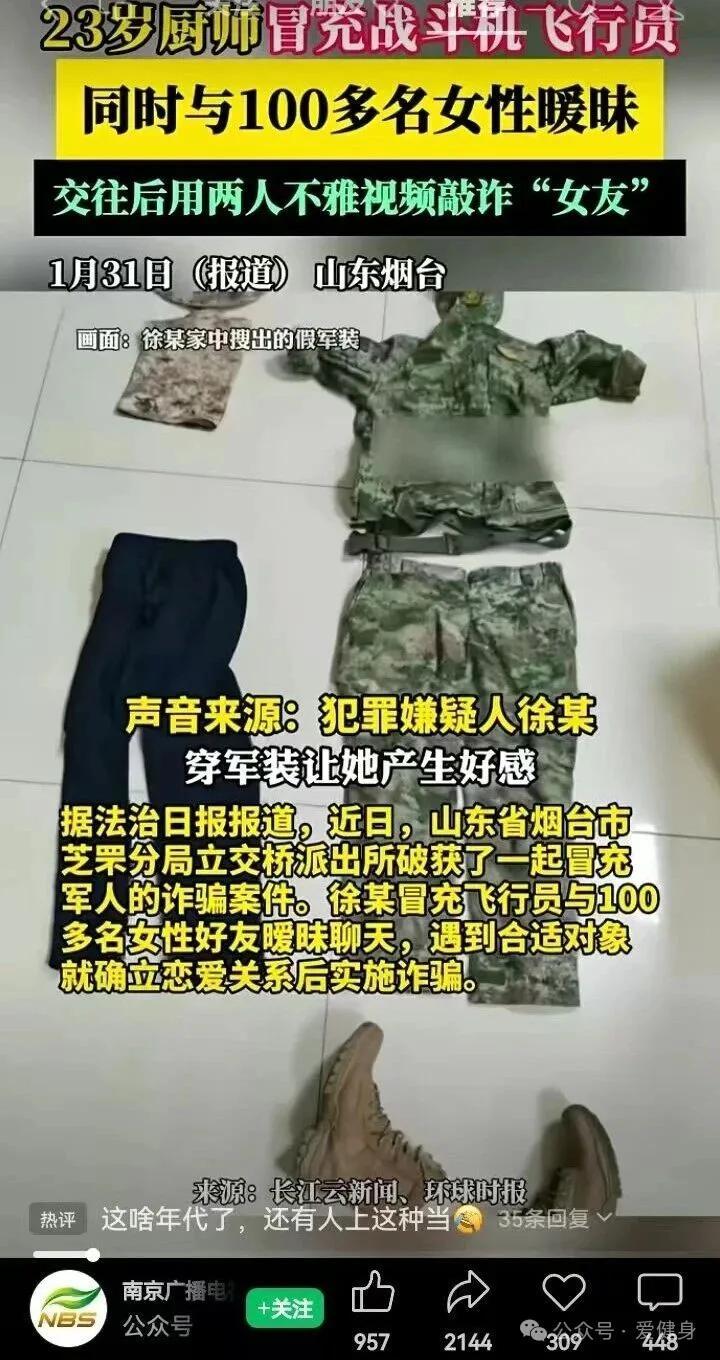 事情是這樣的:說一23歲男廚師,冒充戰鬥機飛行員,同時與100多名女性曖昧。遇到合適對象就確立戀愛關係,後面實施詐騙,騙財又騙色。男子被抓後說,穿軍裝讓女生產生好感。還編造爲保護殲-16受傷,然後一人分飾3個角色,用兩人私密視頻敲詐“女友”。有女受害者說,用大號慫恿我去貸款,用小號威脅我要我錢。