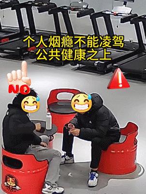 這是一家24小時共享健身房監控拍到的,兩男子坐在休息區。一位男子坐在那裏玩手機,另一位男子竟然在抽菸。