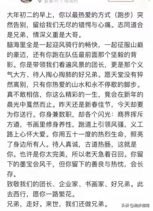 這位集企業家、運動團長、公益人於一身的中年跑者,堅持晨跑多年,每月跑量200多公里,是朋友圈裏的“運動標杆”,卻永遠倒在了自己最熟悉的跑道上,聽聞消息,心裏滿是惋惜與痛心。