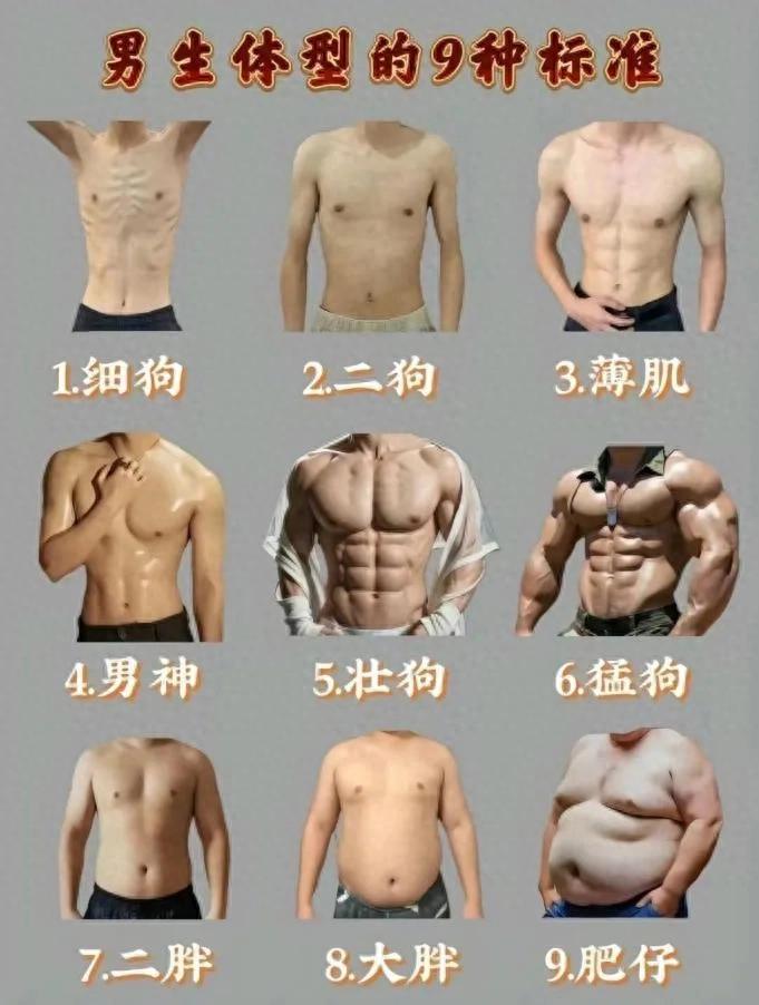 先來看男人9種身材,分別是:1、細狗。2、二狗。3、薄肌。4、男神。5、壯狗。6、猛狗。7、二胖。8、大胖。9、肥仔。