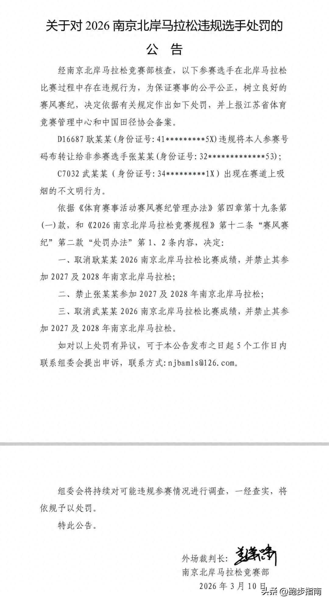 南京北岸馬拉松組委會果斷出手,比賽結束次日便發佈處罰公告,對3名違規選手作出取消成績、禁賽兩年的嚴厲處罰,爲賽道的文明立下規矩!