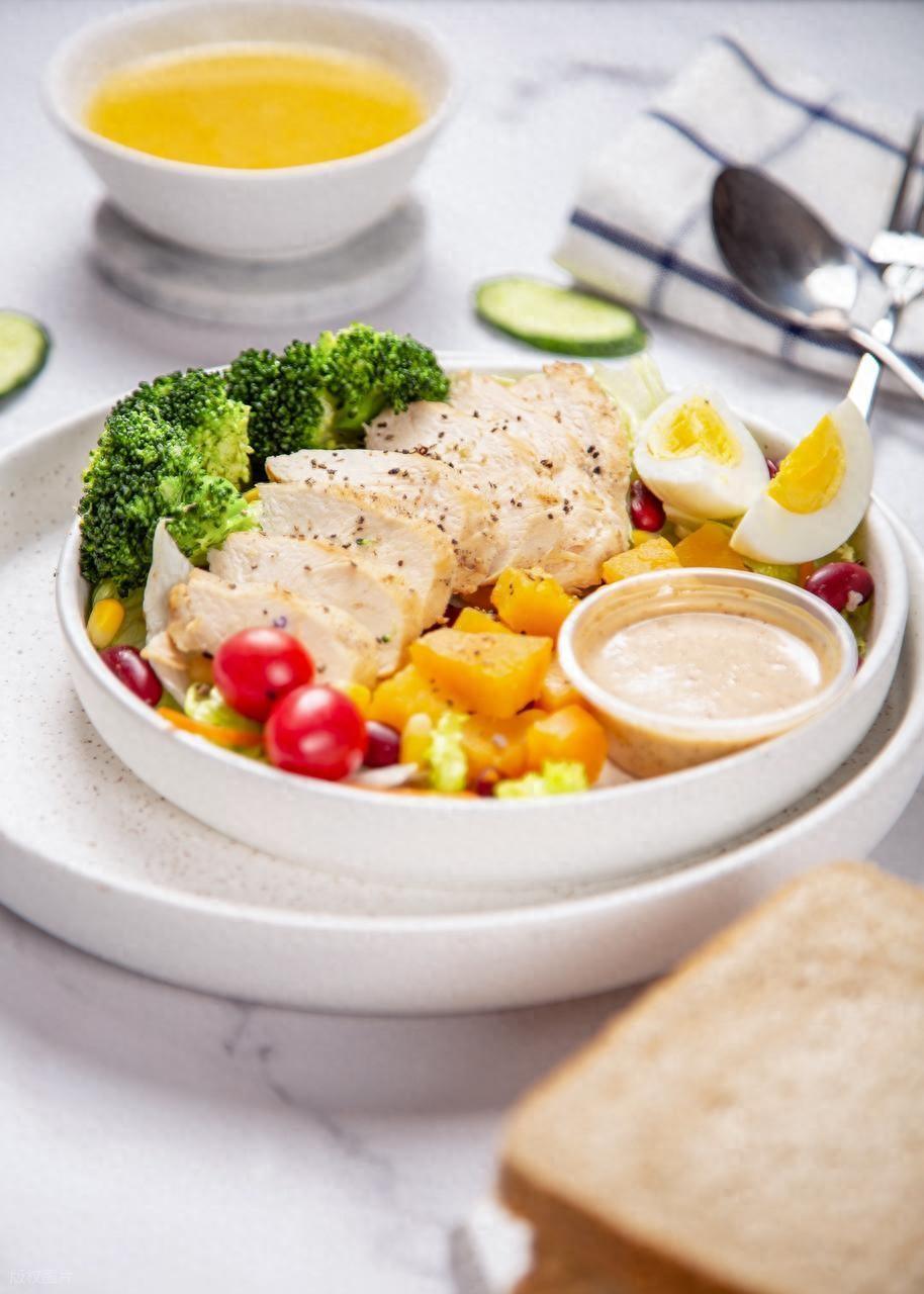 食譜4、1個水煮蛋(優質蛋白)+100克涼拌雞胸肉(動物蛋白)+200克水煮西蘭花(膳食纖維),熱量合計300大卡左右。