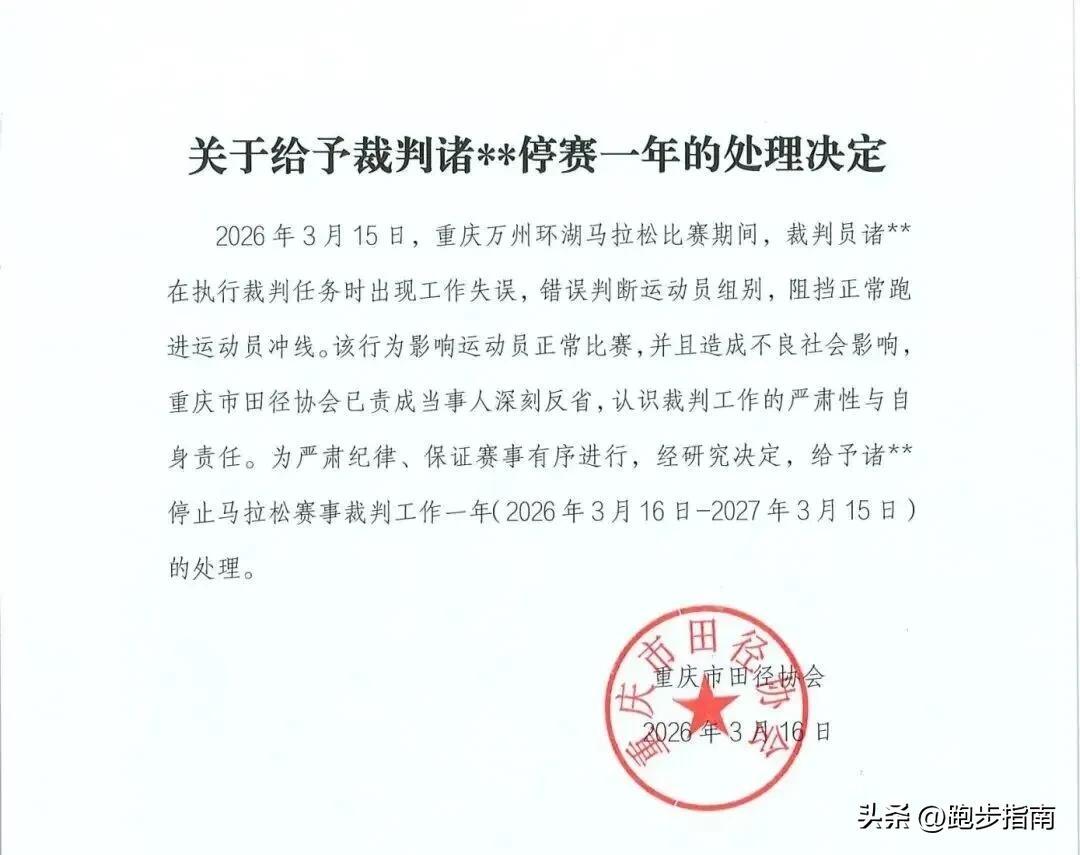 但事件發酵後,重慶田協迅速出手,對涉事裁判作出停賽一年的處罰,明確其錯誤判定組別、干擾選手衝線,造成不良社會影響。