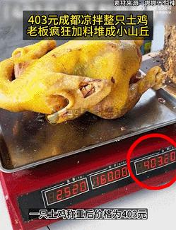 事情是這樣的:四川一女子買涼拌土雞,一隻竟然要403元。更讓女子驚呆的是,讓賣雞老闆少放料,結果老闆狂加20多勺糖,還有花椒等其它調料。