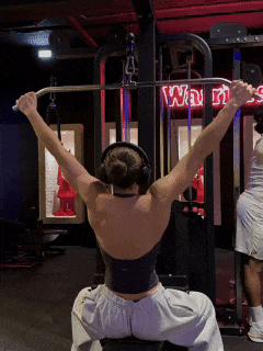 最後切換到健身房,小姐姐的高位下拉動作也是讓人眼前一亮。倒三角身材妥妥滴,背部寬度驚人。女生練出這樣的背,真是愛了 。