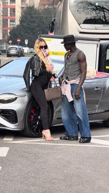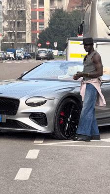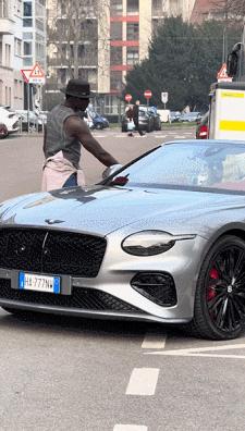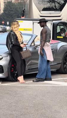 肌肉黑哥就從車裏拿出玫瑰花送給她,美女聞了聞玫瑰花,並和肌肉黑哥交談了幾句。