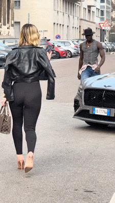 一金髮翹臀美女與一位肌肉黑哥面對面路過。或許是黑哥一身肌肉太吸睛,美女轉頭看了一下。黑哥看到後,朝美女做了一個手勢。