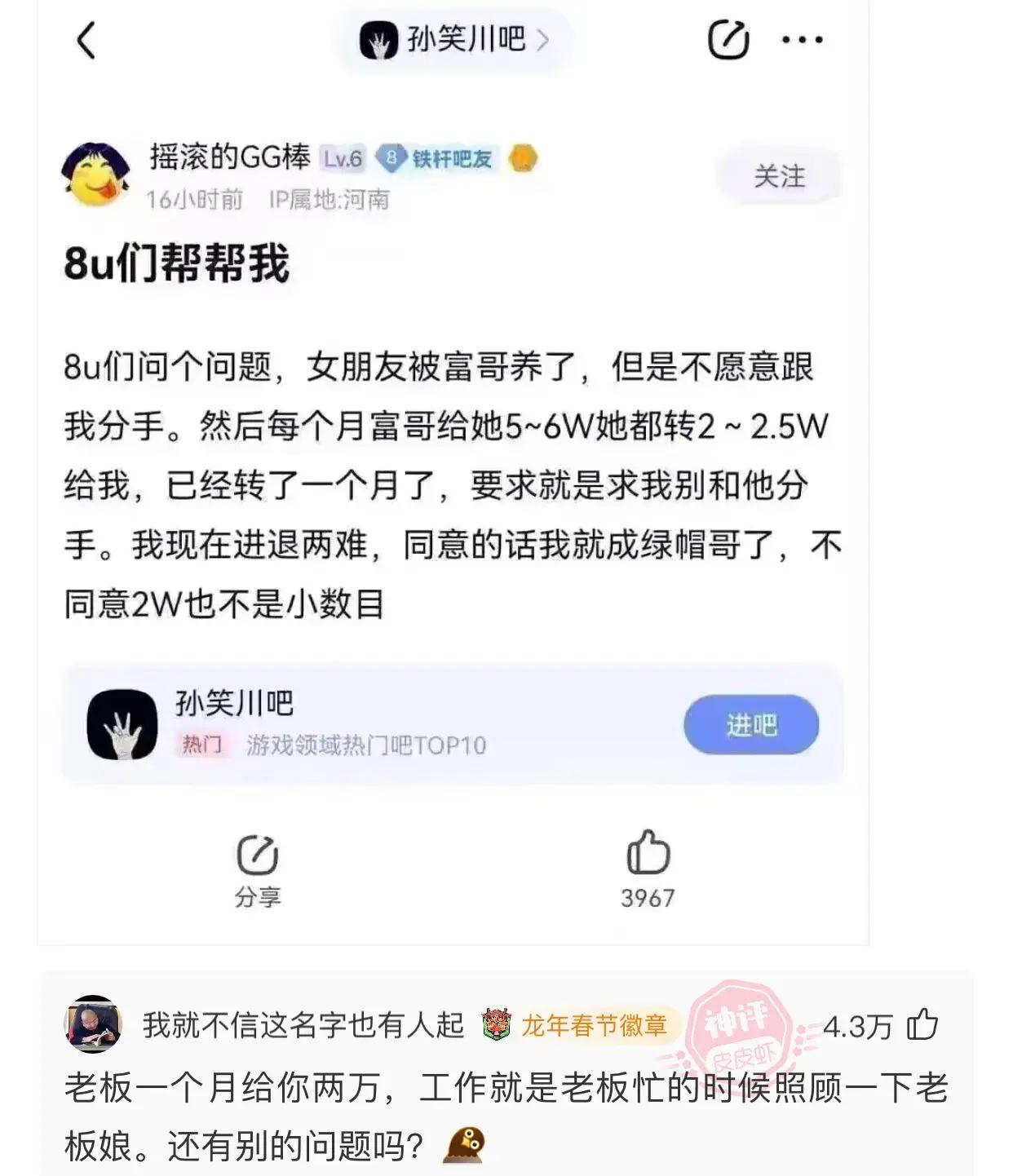 爆笑神評:女朋友被富哥養了,但是不願意跟我分手